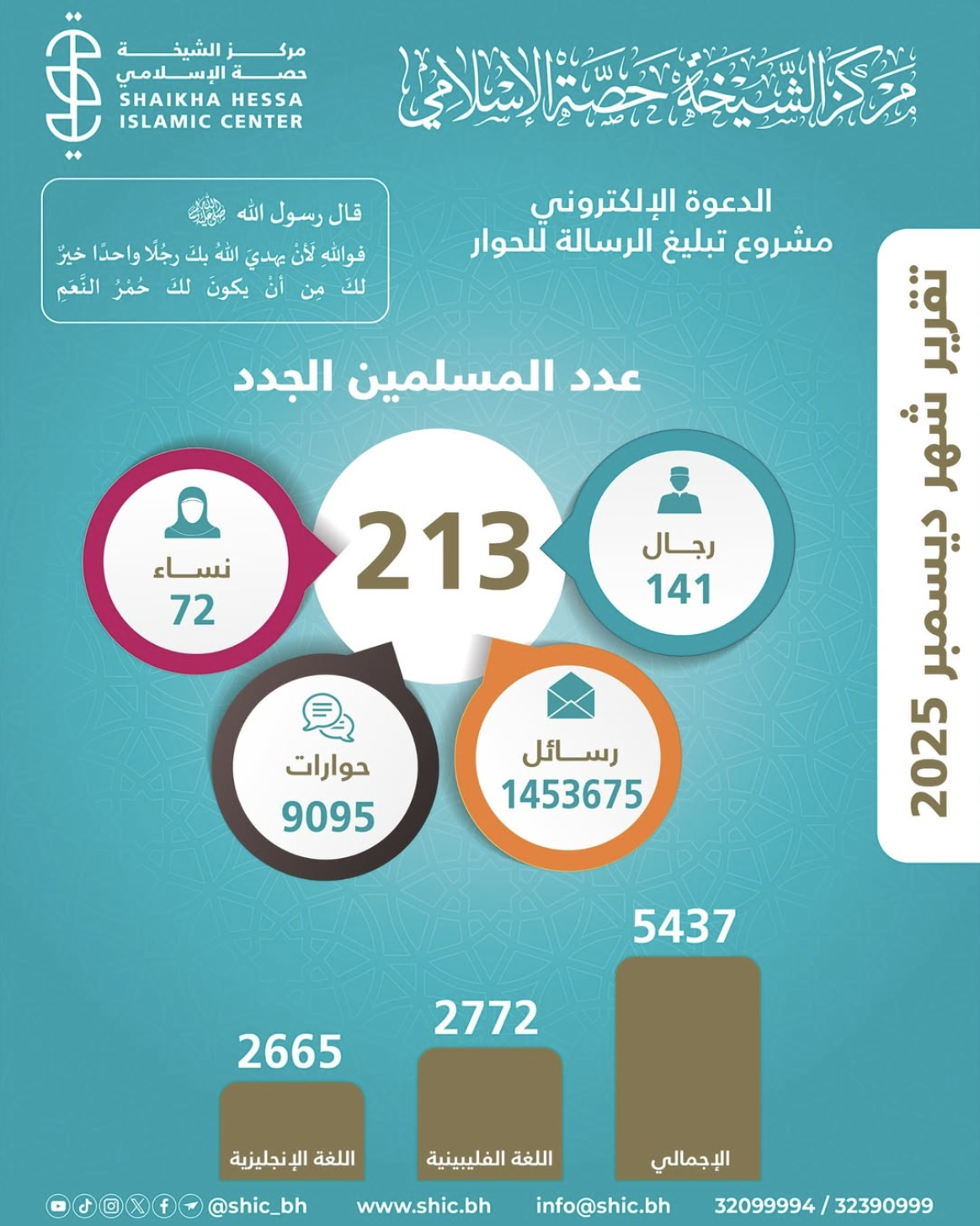 مركز دعوي (غير ربحي) متخصص في الدعوة إلى الله عز وجل ونشر رسالة الإسلام السمحاء بمختلف اللغات تأسس في تاريخ 2023/01/01م مقره مملكة البحرين مسجل بوزارة العدل والشؤون الإسلامية والأوقاف برقم 8/ج/2023م، يهدف إلى دعوة غير المسلمين، وتعليم المسلمين، ورعاية المهتدين، وصناعة المحتوى الدعوي والتعليمي بالحكمة والموعظة الحسنة وفق الكتاب والسنة بميزان الوسطية والاعتدال، ويسعى المركز لتحقيق أهدافه واستراتيجياته عبر مشاريع نوعية ومبادرات مبتكرة بشراكات فاعلة في المجتمع البحريني